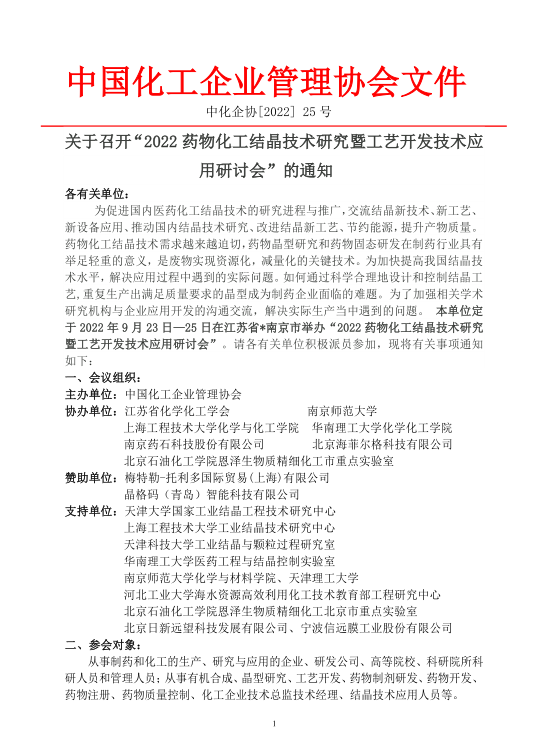 如何通过科学合理地设计和控制结晶工艺,重复生产出满足质量要求的晶型成为制药企业面临的难题!药物化工结晶技术需求越来越迫切!为促进国内医药化工结晶技术的研究进程与推广,交流结晶新技术、新工艺、新设备应用、推动国内结晶技术研究、改进结晶新工艺、节约能源,提升产物质量,解决实际生产当中遇到的问题,“2022药物化工结晶技术研究暨工艺开发技术应用研讨会”将于9月23日-25日在六朝古都-南京盛大开幕!